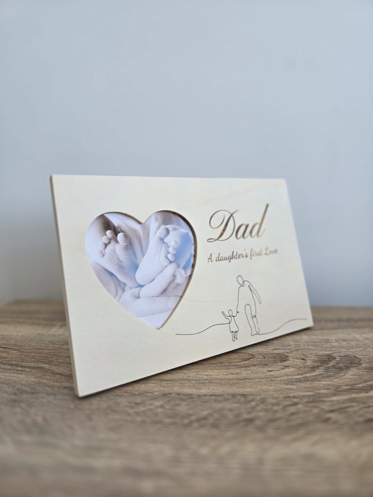 This laser-engraved plywood frame measures 23.4cm by 15.4cm by 0.9cm, making it a perfect size to display cherished memories. Featuring the heartfelt message "Dad, a daughter's first love," it serves as a meaningful gift for birthdays or Father’s Day. The natural wood finish adds warmth and character, creating a timeless keepsake that honors the special bond between father and daughter.